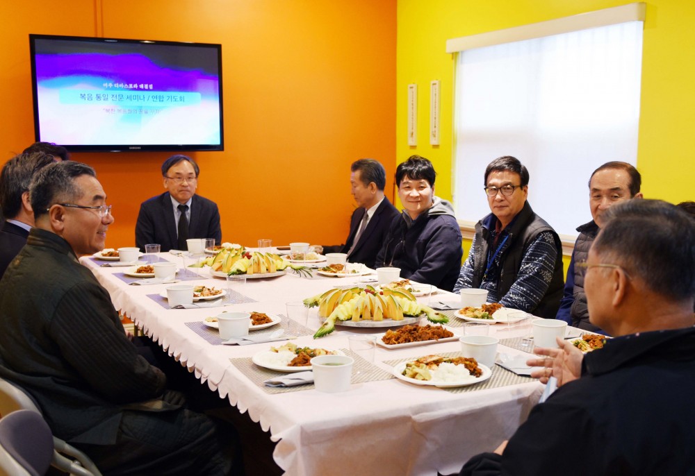 우리 교회 주관 복음통일전문세미나 및 연합기도회가 지난 2월 12일(화) 오후 2시부터 15일(금) 오후 4시 30분까지 4일간 열렸습니다. 또한, 12일(화)부터 15일(목)까지는 오후 7시, 15일(금)에는 오후 7시 45분에 저녁집회로 모였습니다. 국제통일전문가네트워크(Global Expert Network for Reunification Korea, 대표 임현수 목사, 공동대표 정성진 목사, 고명진 목사, 신창민 박사, 총무 박상원 목사)가 주최하는 이번 세미나 및 기도회는 ‘100년 전 삼일독립을 2019년 복음통일로’를 표어로, ‘북한 복음화의 꿈을 꾸자’라는 주제하에 열렸습니다. 고국의 복음통일을 위해 선교역사, 정치, 경제, 교육, 문화와 영화, 동족선교 사역 등 한국과 미국의 다양한 전문가들이 모여 강의하고 말씀을 선포했습니다.