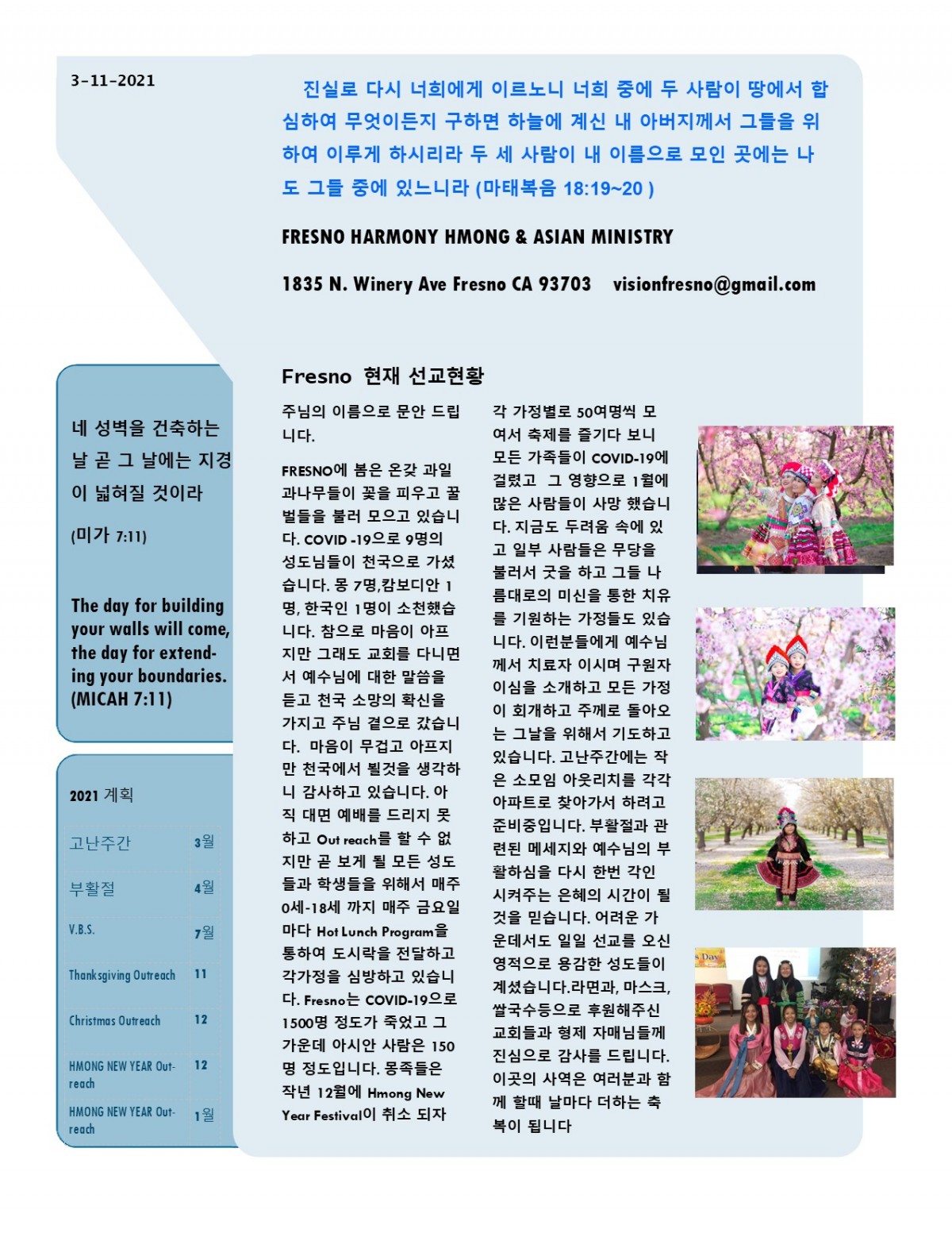 2021년 3월 프레즈노 황인주/사라 선교사님 기도편지입니다.