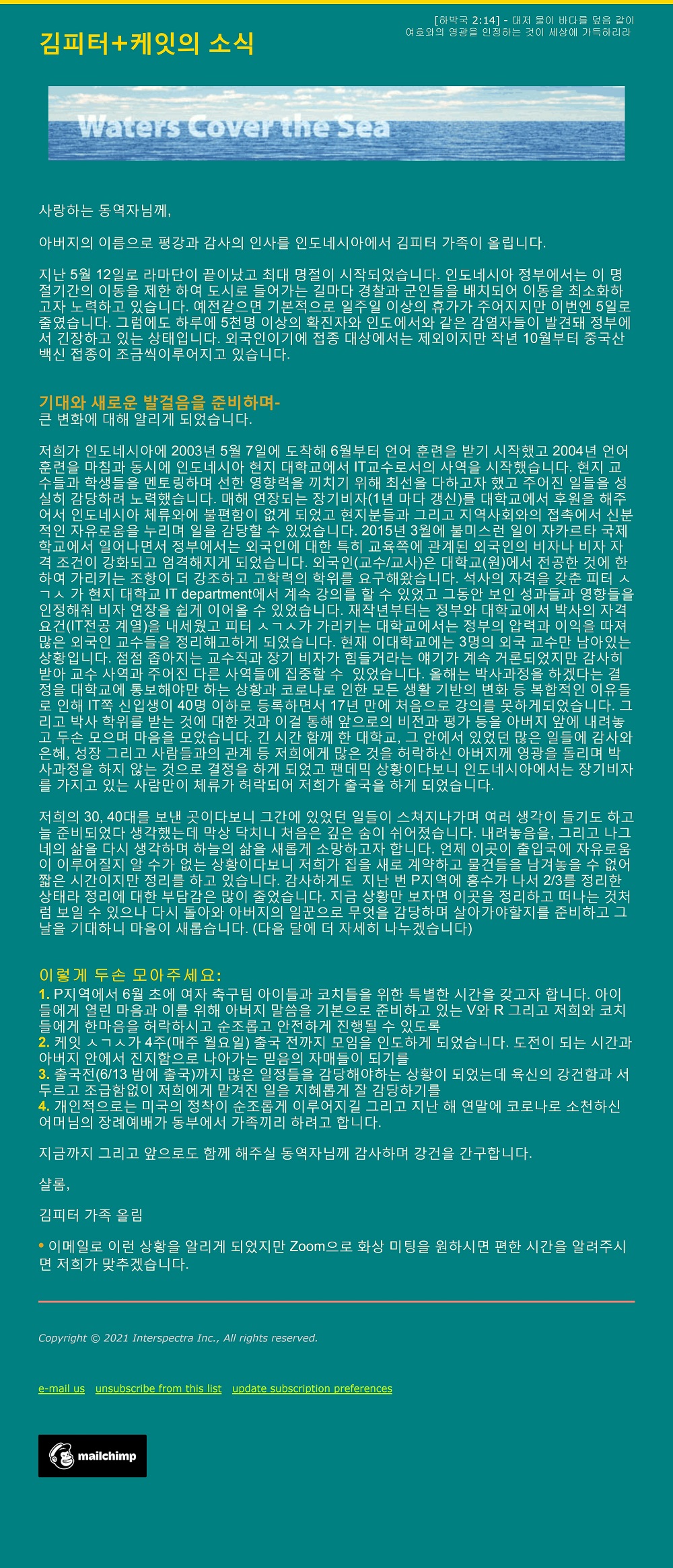 2021년 인도네시아 김피터 케잇 선교사님 기도편지입니다 페이지 정보 작성자 김세업 작성일21-05-22 07:17 댓글0건 관련링크 https://mailchi.mp/69508d6a6bf4/21z5p0ngld?e=b918f8624d 3084회 연결 이전글 다음글 목록 본문 2021년 인도네시아 김피터 케잇 선교사님 기도편지입니다 이전글 다음글 목록