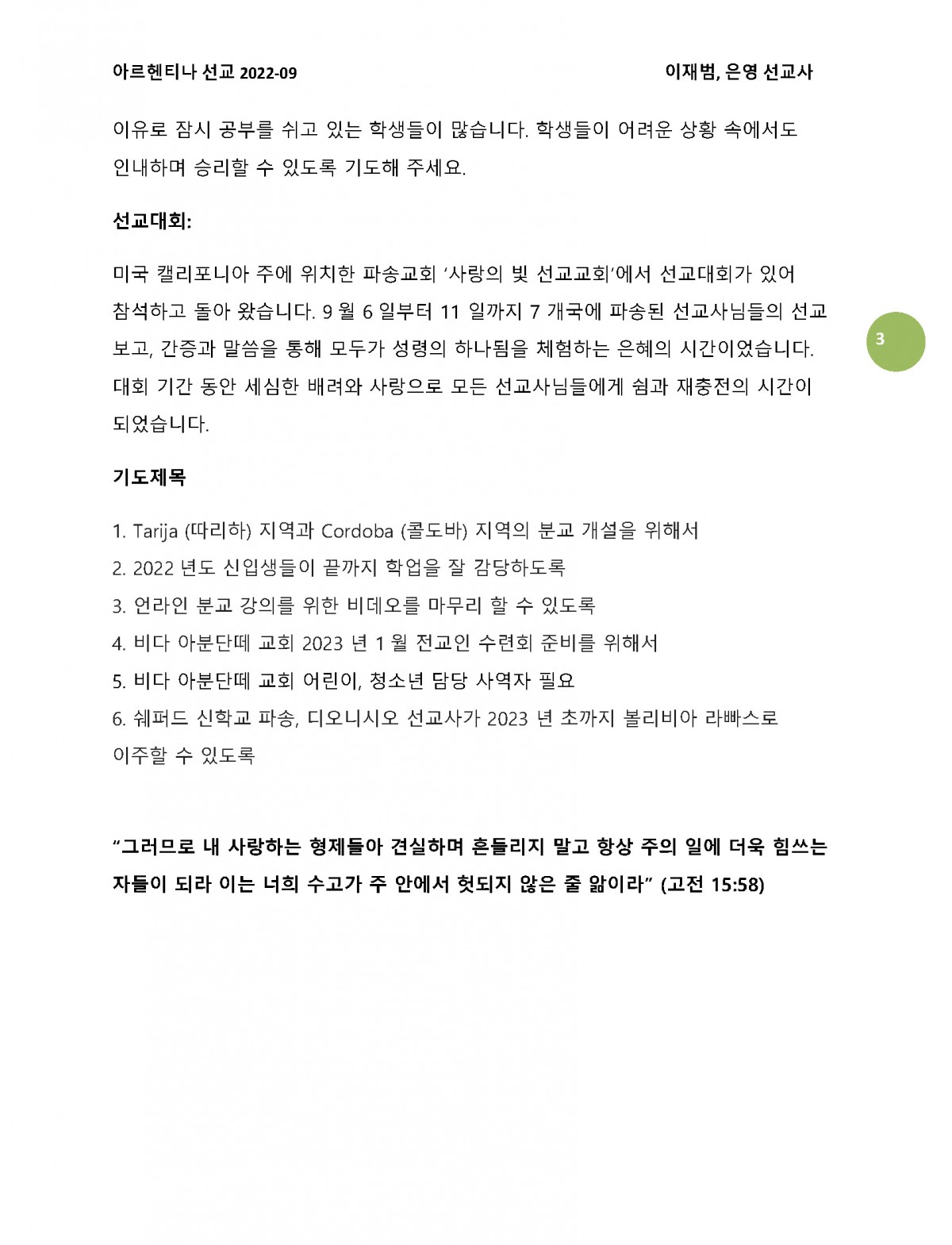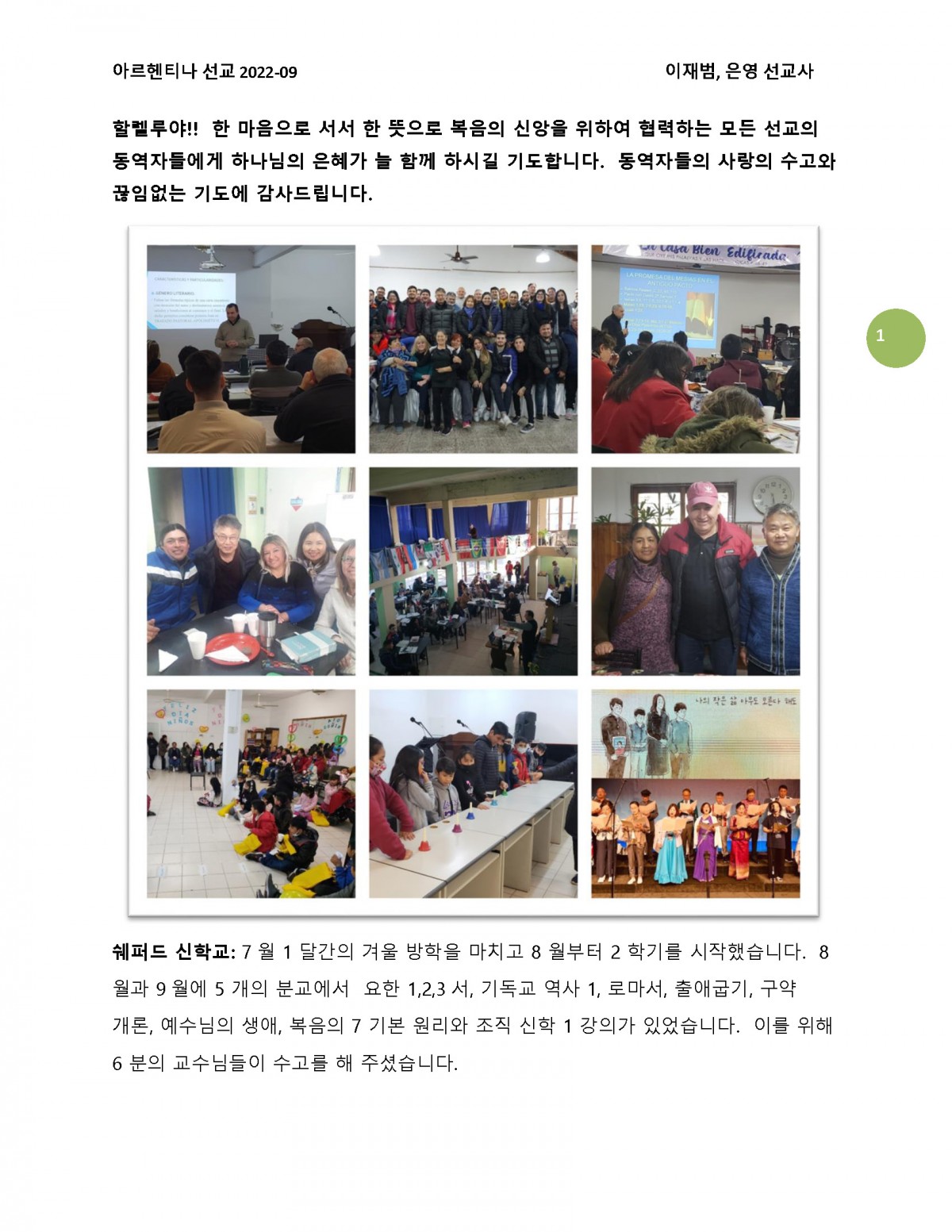 2022년 9월 아르헨티나 이재범, 이은영 선교사님 기도편지입니다.
