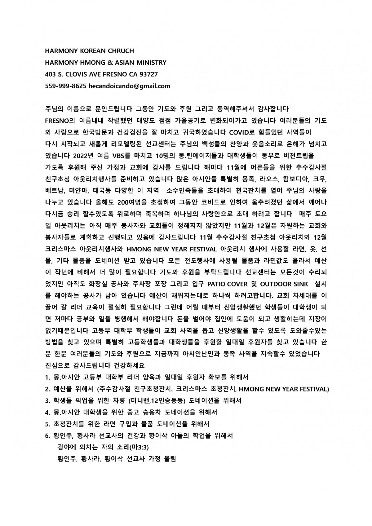 2022년 11월 프레즈노 황인주, 황사라 선교사님 기도편지입니다.