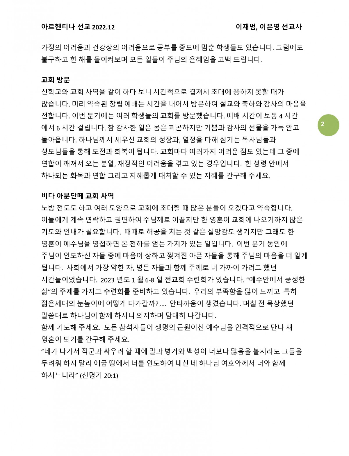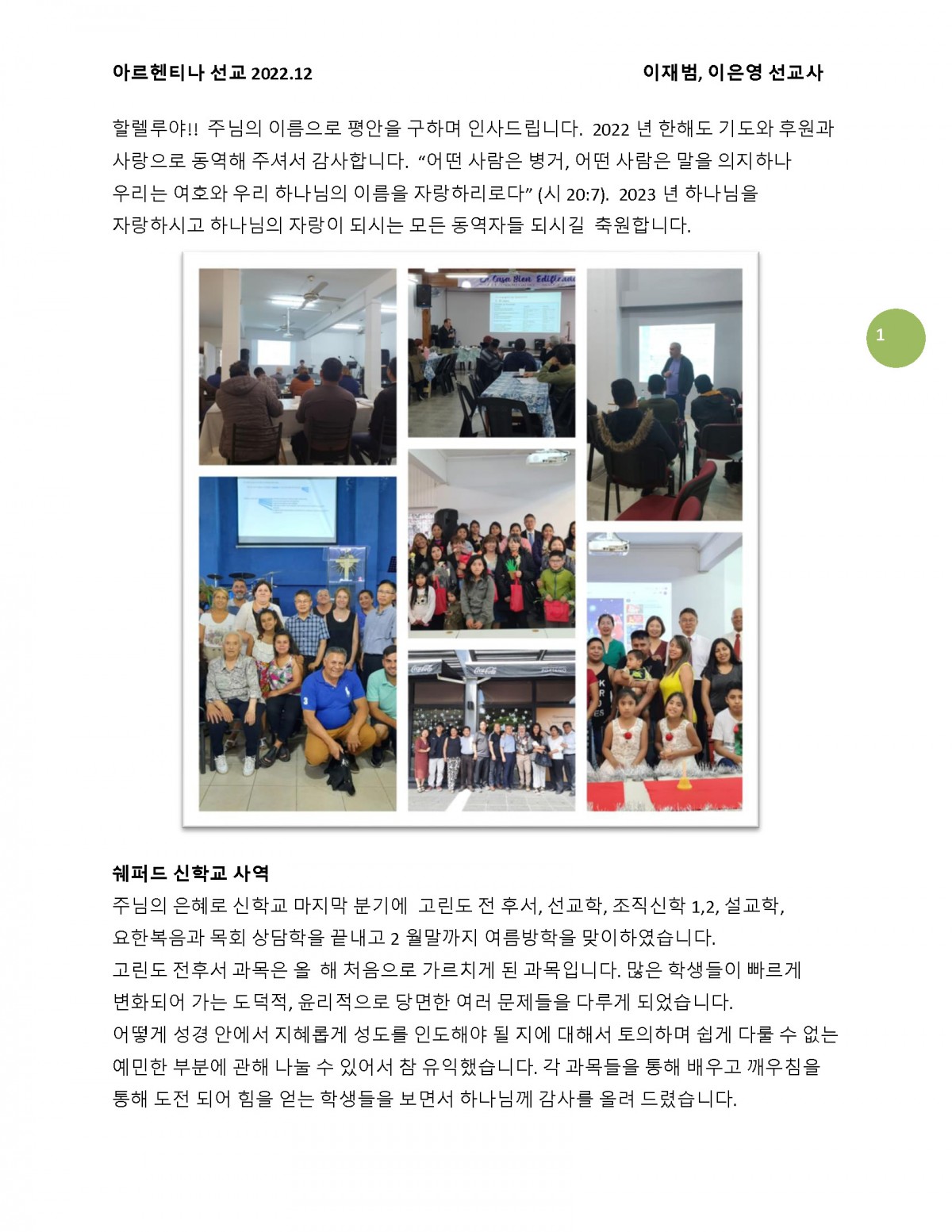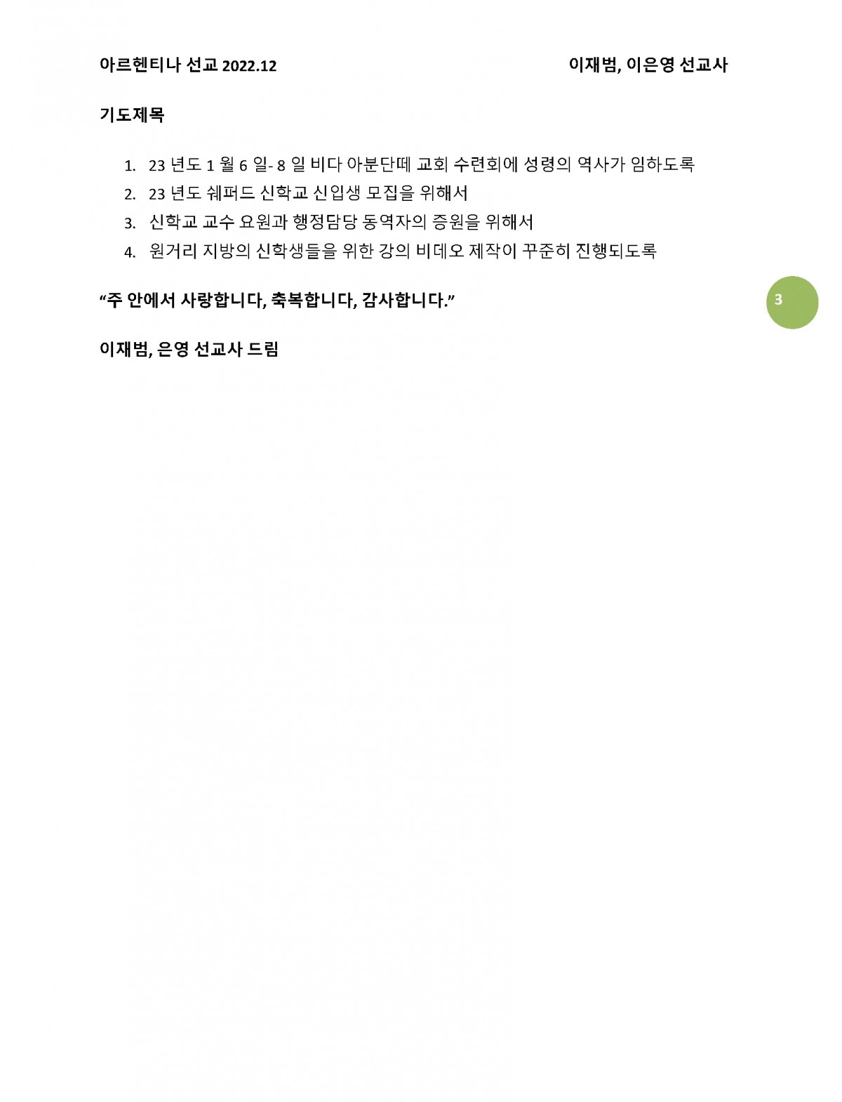 2022년 12월 아르헨티나 이재범, 이은영 선교사님 기도편지입니다. 페이지 정보 작성자 김세업 작성일23-01-01 04:08 댓글0건 관련링크 이전글 다음글 목록 본문 2022년 12월 아르헨티나 이재범, 이은영 선교사님 기도편지입니다. 이전글 다음글 목록