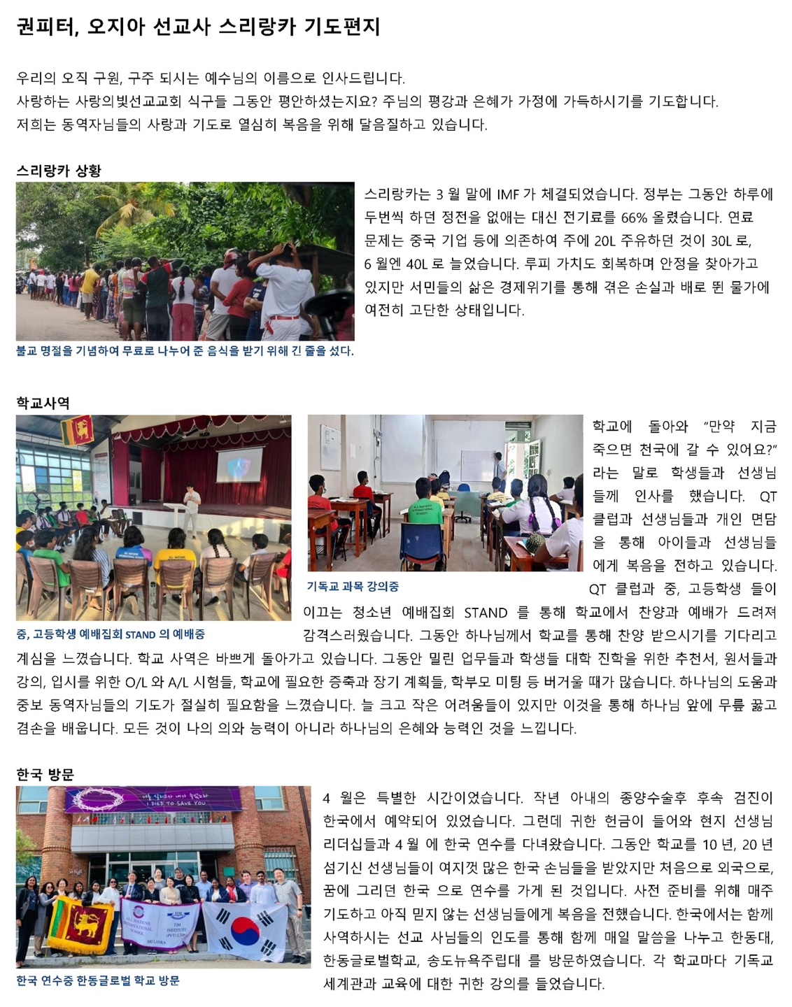 2023년 6월 스리랑카 권피터 오지아 선교사님의 기도편지입니다.