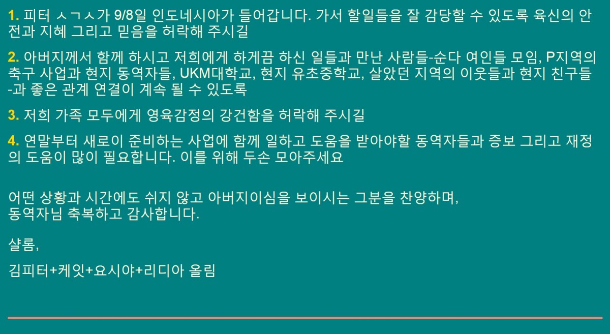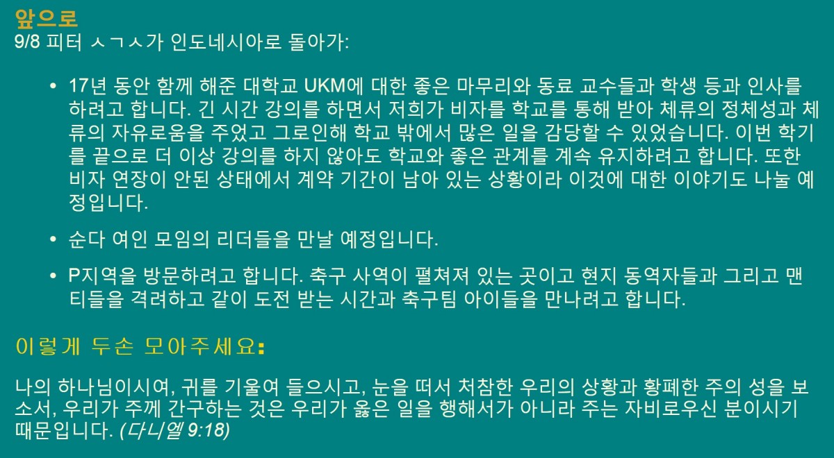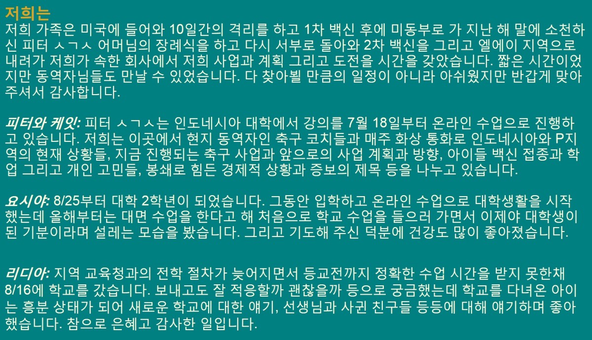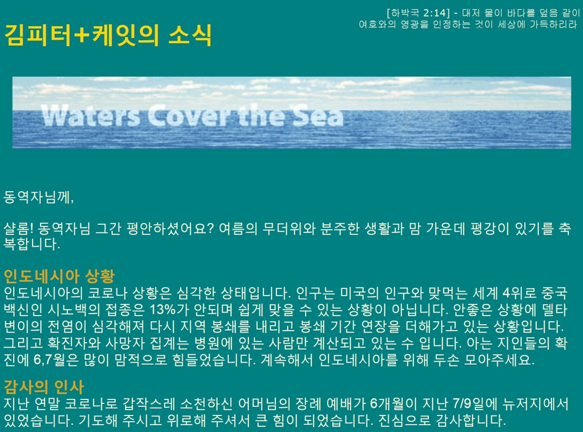 2021년 8월 김피터, 케잇 선교사님 기도편지입니다. 페이지 정보 작성자 김세업 작성일21-09-01 01:30 댓글0건 관련링크 https://mailchi.mp/8c1ffa77ec3a/ln5xk3y5i8?e=b918f8624d 2842회 연결 이전글 다음글 목록 본문 2021년 8월 김피터, 케잇 선교사님 기도편지입니다. 이전글 다음글 목록