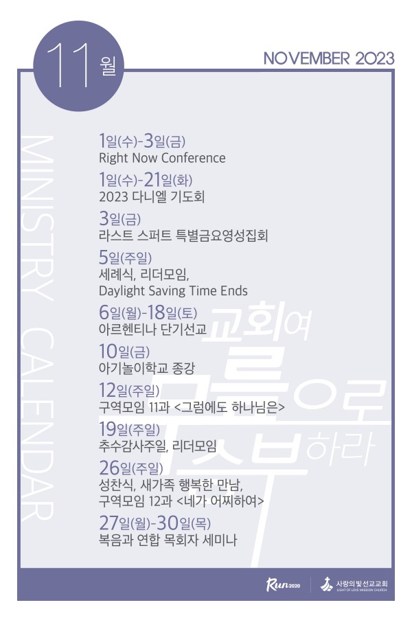 2023년 11월 사역캘린더 페이지 정보 작성자 사랑의빛선교교회 작성일23-11-02 02:15 댓글0건 관련링크 이전글 다음글 목록 본문 2023년 11월 사역입니다. 이전글 다음글 목록