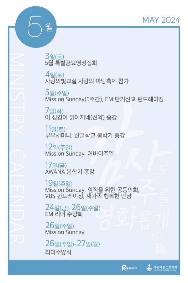 2024년 5월 사역캘린더 페이지 정보 작성자 사랑의빛선교교회 작성일24-05-04 05:50 댓글0건 관련링크 이전글 다음글 목록 본문 2024년 5월 사역입니다. 이전글 다음글 목록
