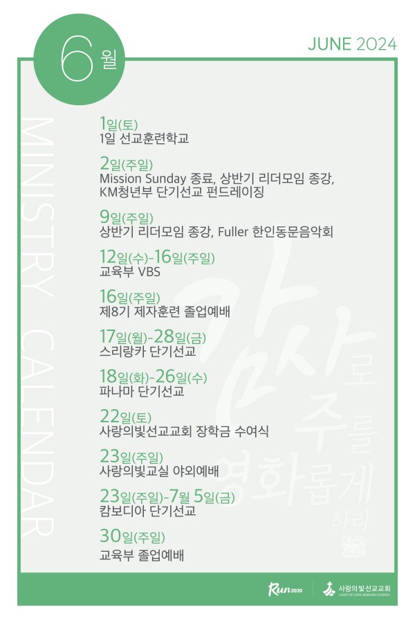 2024년 6월 사역캘린더 페이지 정보 작성자 사랑의빛선교교회 작성일24-06-08 05:33 댓글0건 관련링크 이전글 다음글 목록 본문 2024년 6월 사역입니다. 이전글 다음글 목록
