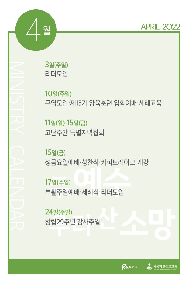 2022년 4월 사역캘린더 페이지 정보 작성자 사랑의빛선교교회 작성일22-04-02 06:32 댓글0건 관련링크 이전글 다음글 목록 본문 2022년 4월 사역입니다. 이전글 다음글 목록