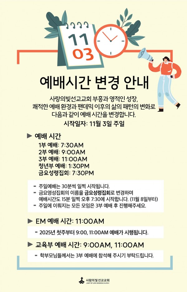 교회의 부흥과 영적인 성장, 은혜롭고 원활한 예배를 위해 11월 3일(주일)부터 예배시간이 변경됩니다.