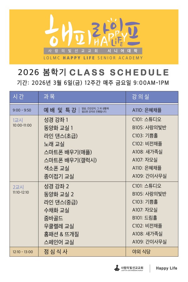 2026 해피라이프 봄학기 개강 페이지 정보 작성자 사랑의빛선교교회 작성일26-02-20 07:07 댓글0건 관련링크 다음글 목록 본문 개강: 3월 6일부터 매주 금 9AM(12주간), 은혜채플 문의: 양용진 목사, 조영서 장로 (818)266-8893 다음글 목록