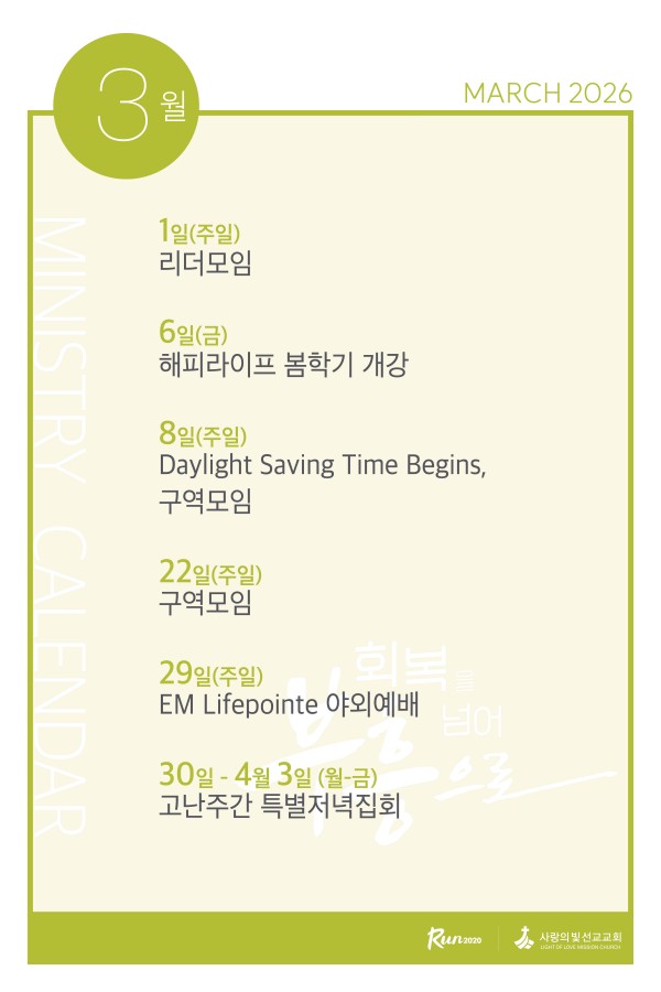 2026년 3월 사역캘린더 페이지 정보 작성자 사랑의빛선교교회 작성일26-02-27 08:57 댓글0건 관련링크 이전글 다음글 목록 본문 2026년 3월 사역입니다. 이전글 다음글 목록