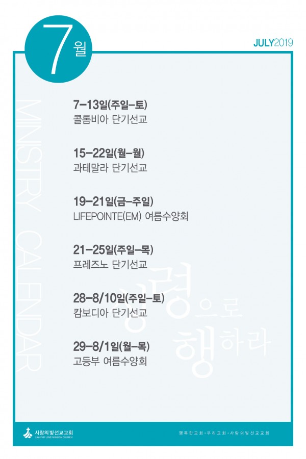 2019년 7월 사역캘린더 페이지 정보 작성자 사랑의빛선교교회 작성일19-06-28 03:23 댓글0건 관련링크 이전글 다음글 목록 본문 2019년 7월 사역입니다. 이전글 다음글 목록