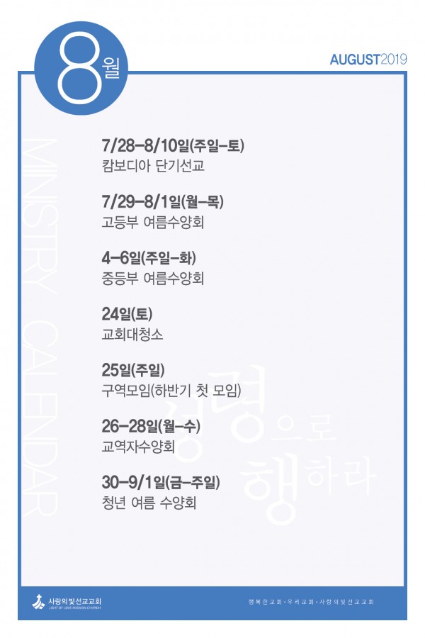 2019년 8월 사역캘린더 페이지 정보 작성자 사랑의빛선교교회 작성일19-07-31 06:39 댓글0건 관련링크 이전글 다음글 목록 본문 2019년 8월 사역입니다. 이전글 다음글 목록