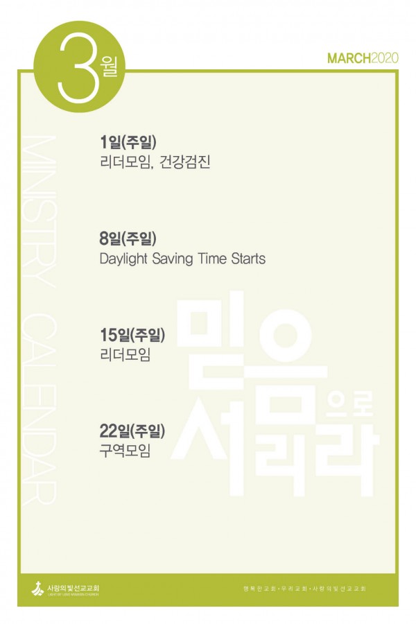 2020년 3월 사역캘린더 페이지 정보 작성자 사랑의빛선교교회 작성일20-03-06 04:51 댓글0건 관련링크 이전글 다음글 목록 본문 2020년 3월 사역입니다. 이전글 다음글 목록