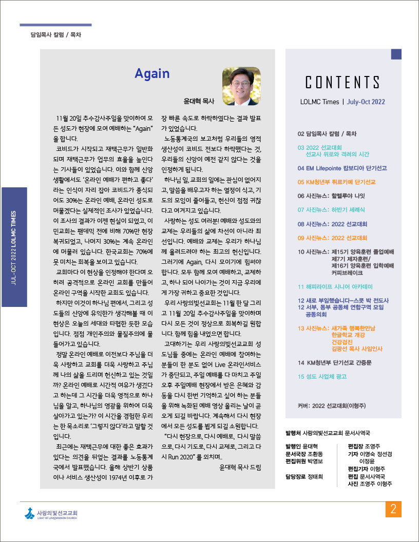 July-October 2022 페이지 정보 작성자 사랑의빛선교교회 작성일22-11-07 02:32 댓글0건 관련링크 이전글 다음글 목록 본문 July-October 2022 이전글 다음글 목록