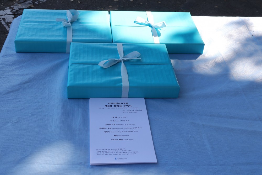 제2기 사랑의빛선교교회 장학금 수여식이 2020년 10월 3일 제1주차장에서 있었습니다.