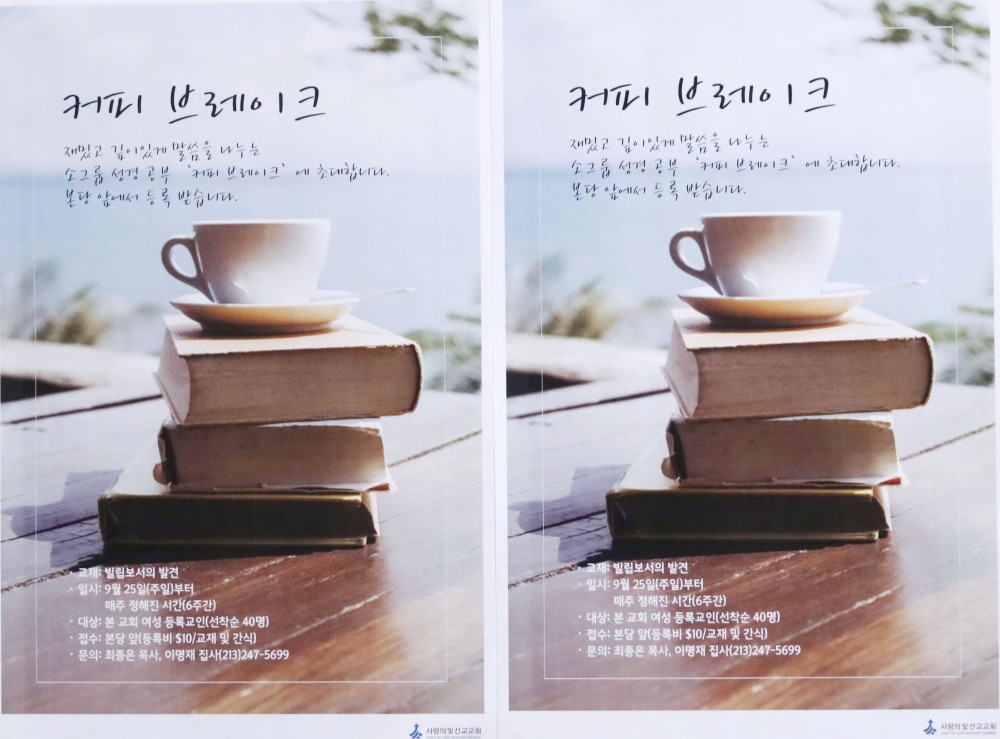 커피 브레이크(Coffee Break)"빌립보서의 발견" 페이지 정보 작성자 사랑의빛선교교회 작성일22-10-29 00:15 댓글0건 관련링크 이전글 다음글 목록 본문 깊이 있게 말씀을 나누는 소그룹 성경 공부 커피 브레이크(Coffee Break) "빌립보서의 발견"이 9월 25일 (주일)부터 6주간 (화요일 오전/ 화요일,목요일 저녁/ 금요일,토요일 오전) 본교 여성 등록 교인을 대상으로 시작되었습니다. 이전글 다음글 목록