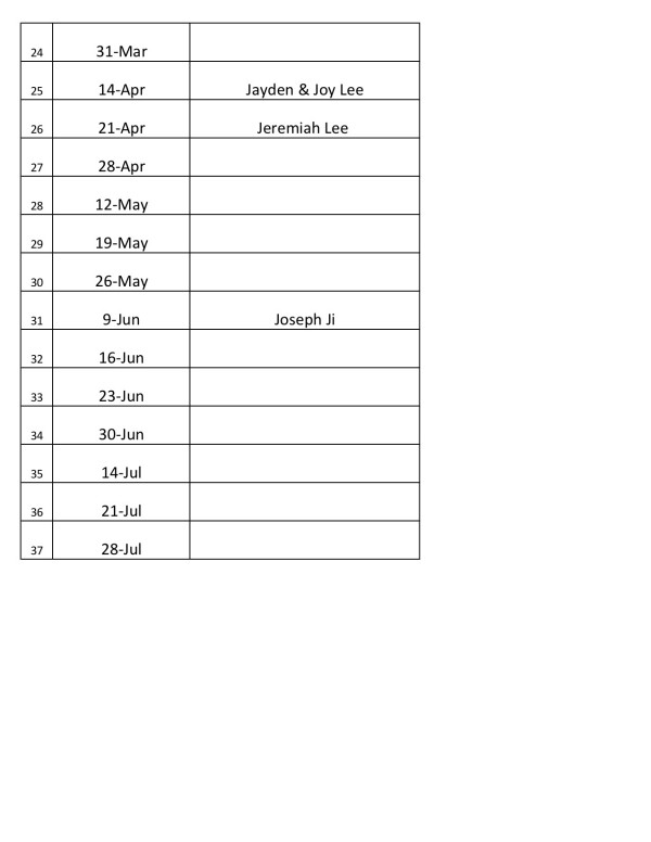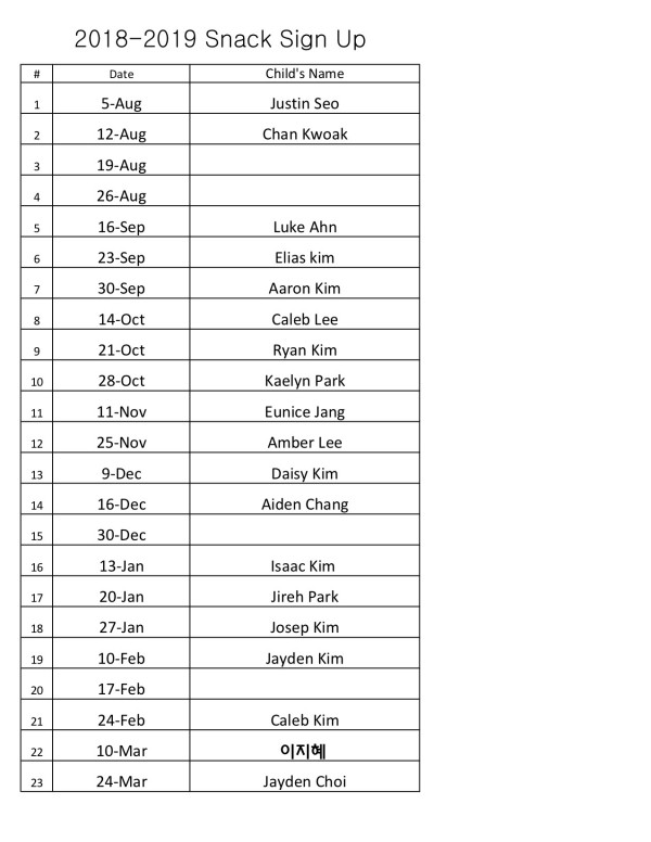 유치유년부 주일 간식에 Sign-Up 해주신 분들께 감사드립니다.