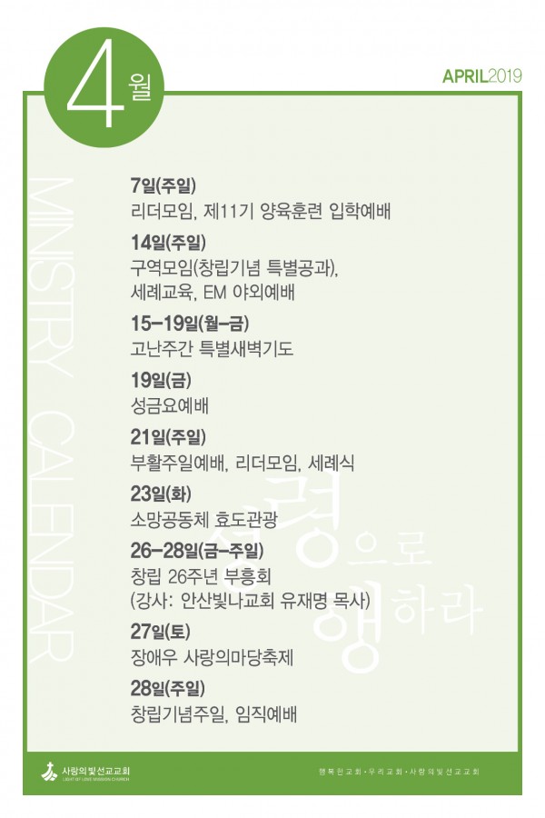 2019년 4월 사역캘린더 페이지 정보 작성자 사랑의빛선교교회 작성일19-05-04 01:51 댓글0건 관련링크 이전글 다음글 목록 본문 2019년 4월 사역입니다. 이전글 다음글 목록