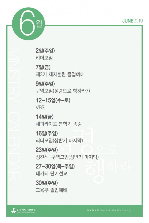 2019년 6월 사역캘린더 페이지 정보 작성자 사랑의빛선교교회 작성일19-06-05 03:01 댓글0건 관련링크 이전글 다음글 목록 본문 2019년 6월 사역입니다. 이전글 다음글 목록