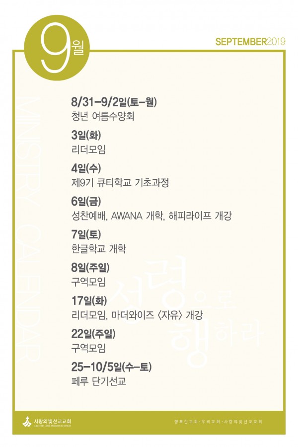 2019년 9월 사역캘린더 페이지 정보 작성자 사랑의빛선교교회 작성일19-08-31 06:50 댓글0건 관련링크 이전글 다음글 목록 본문 2019년 9월 사역입니다. 이전글 다음글 목록