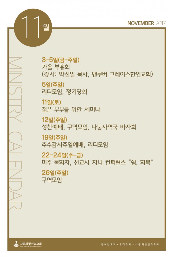 2017년 11월 사역 캘린더 페이지 정보 작성자 최고관리자 작성일17-11-04 09:41 댓글0건 관련링크 이전글 다음글 목록 본문 2017년 11월 사역 일정입니다. 이전글 다음글 목록