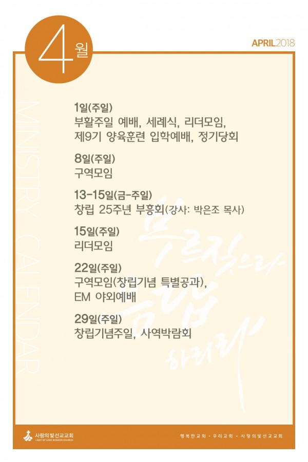 2018년 4월 사역 캘린더 페이지 정보 작성자 최고관리자 작성일18-04-07 02:09 댓글0건 관련링크 이전글 다음글 목록 본문 2018년 4월 사역 일정입니다. 이전글 다음글 목록