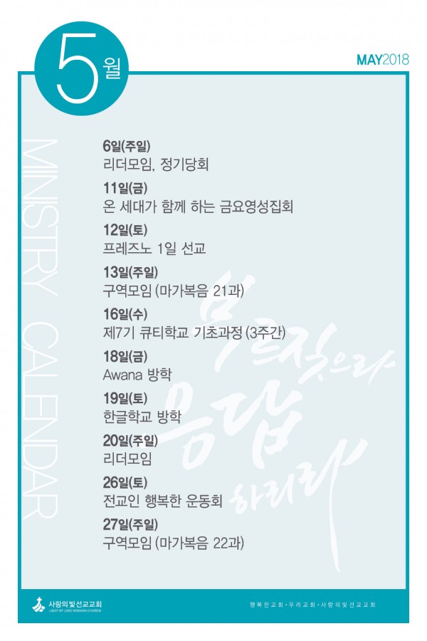 2018년 5월 사역 캘린더 페이지 정보 작성자 최고관리자 작성일18-05-18 08:20 댓글0건 관련링크 이전글 다음글 목록 본문 2018년 5월 사역 캘린더 입니다. 이전글 다음글 목록