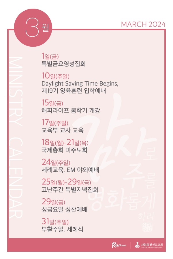 2024년 3월 사역캘린더 페이지 정보 작성자 사랑의빛선교교회 작성일24-03-02 07:31 댓글0건 관련링크 이전글 다음글 목록 본문 2024년 3월 사역입니다. 이전글 다음글 목록