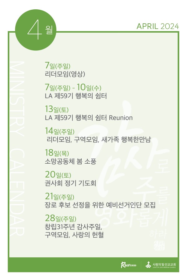 2024년 4월 사역캘린더 페이지 정보 작성자 사랑의빛선교교회 작성일24-04-07 04:00 댓글0건 관련링크 이전글 다음글 목록 본문 2024년 4월 사역입니다. 이전글 다음글 목록
