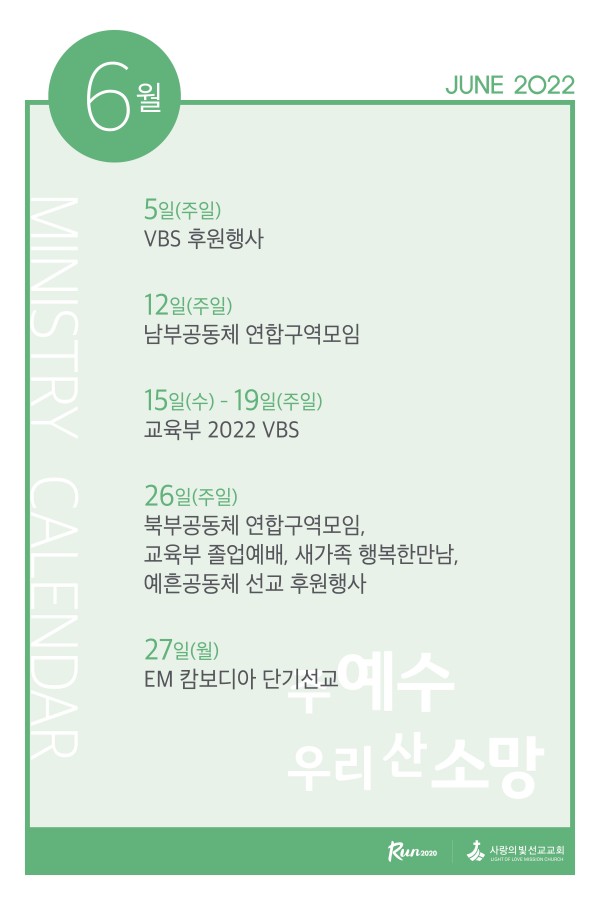 2022년 6월 사역캘린더 페이지 정보 작성자 사랑의빛선교교회 작성일22-06-03 05:46 댓글0건 관련링크 이전글 다음글 목록 본문 2022년 6월 사역입니다. 이전글 다음글 목록