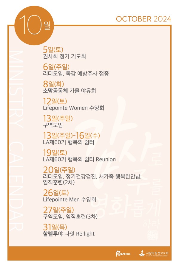 2024년 10월 사역캘린더 페이지 정보 작성자 사랑의빛선교교회 작성일24-09-28 06:20 댓글0건 관련링크 이전글 다음글 목록 본문 2024년 10월 사역입니다. 이전글 다음글 목록