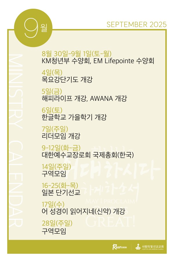 2025년 9월 사역캘린더 페이지 정보 작성자 사랑의빛선교교회 작성일25-08-31 02:22 댓글0건 관련링크 이전글 다음글 목록 본문 2025년 9월 사역입니다. 이전글 다음글 목록