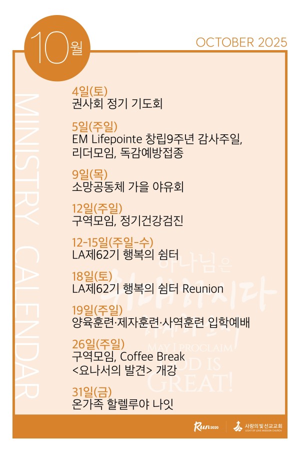 2025년 10월 사역캘린더 페이지 정보 작성자 사랑의빛선교교회 작성일25-10-03 06:05 댓글0건 관련링크 이전글 다음글 목록 본문 2025년 10월 사역입니다. 이전글 다음글 목록