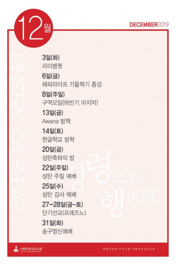 2019년 12월 사역캘린더 페이지 정보 작성자 사랑의빛선교교회 작성일19-11-28 03:31 댓글0건 관련링크 이전글 다음글 목록 본문 2019년 12월 사역입니다. 이전글 다음글 목록