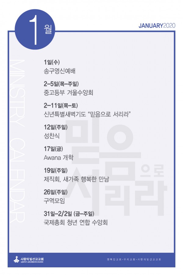 2020년 1월 사역캘린더 페이지 정보 작성자 사랑의빛선교교회 작성일20-01-23 07:13 댓글0건 관련링크 이전글 다음글 목록 본문 2020년 1월 사역입니다. 이전글 다음글 목록