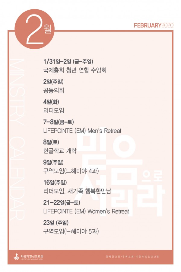 2020년 2월 사역캘린더 페이지 정보 작성자 사랑의빛선교교회 작성일20-01-31 04:38 댓글0건 관련링크 이전글 다음글 목록 본문 2020년 2월 사역입니다. 이전글 다음글 목록